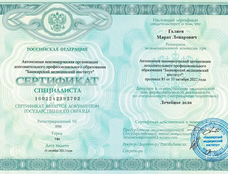 • 2017 — АНО ДПО "Башкирский медицинский институт" – повышение квалификации по специальности "лечебное дело"
