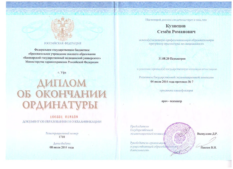 • 2013 — Башкирский Государственный Медицинский университет (ординатура по специальности «психиатрия»)